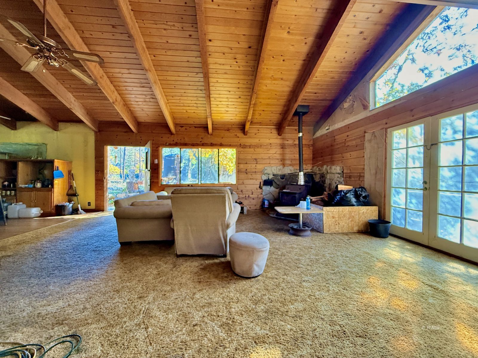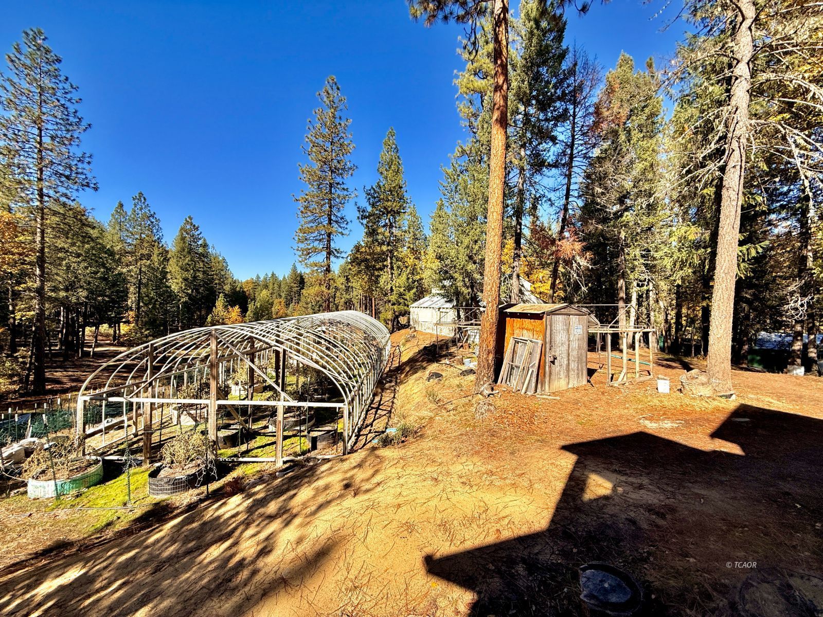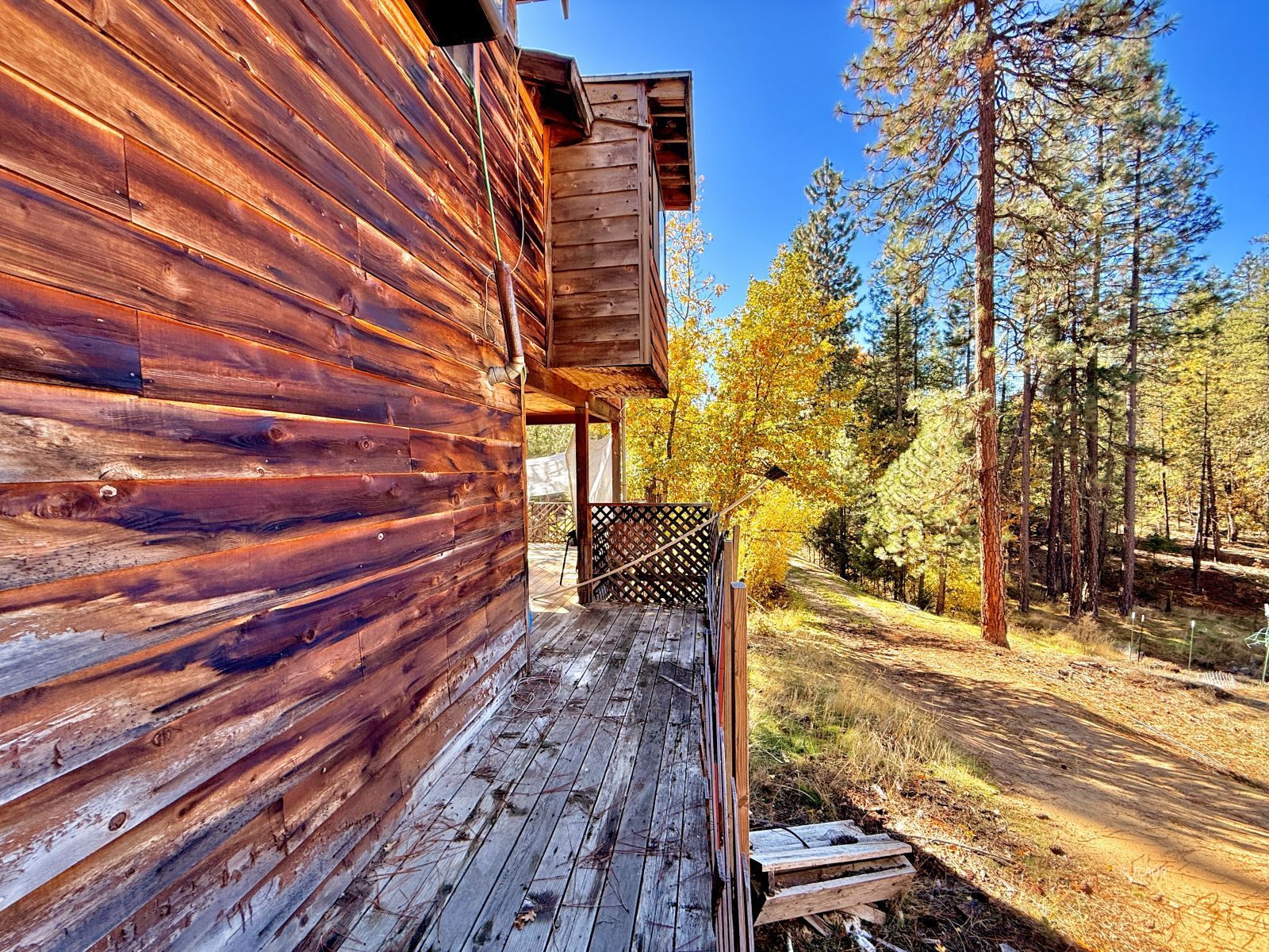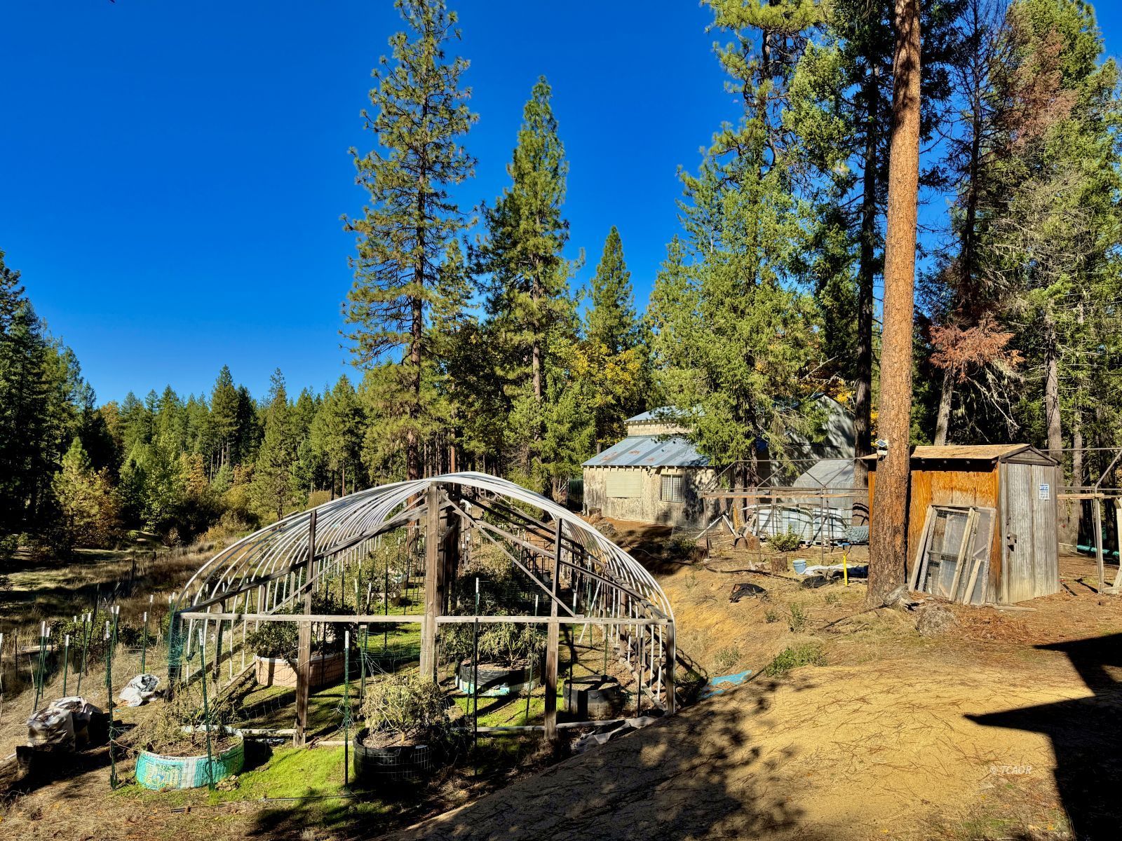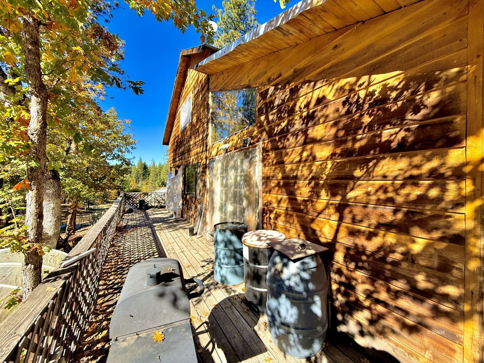 Two adjacent 1.5+ acre lots each with garden sites and solid temporary greenhouses already set up... Newest well and solar water pump components are only 3 years old. A larger 3BD/2BA home with cathedral ceilings and exposed beams. The wrap around deck would make for great outdoor entertaining in the summer overlooking the pond. This well established ranchette was left abandoned a few years ago and will need some plumbing repairs and finishing touches to become a fully functioning residence again. Property is set up for off-grid living with generator wiring, some solar features and a wood-fuel cook stove. After cleanup and repairs, this could be one of the largest, most solid and complete homes in the Trinity Pines subdivision. There's a small pond on the property, bearing water year-round with bass and goldfish. The large garage/barn has room for several cars on the ground level, but also has workshop spaces on each side and an upstairs area for additional storage or an ADU apartment for guests. Parts of garage are insulated with reflective panels and it's fully wired for electric. Both parcels are fully fenced.