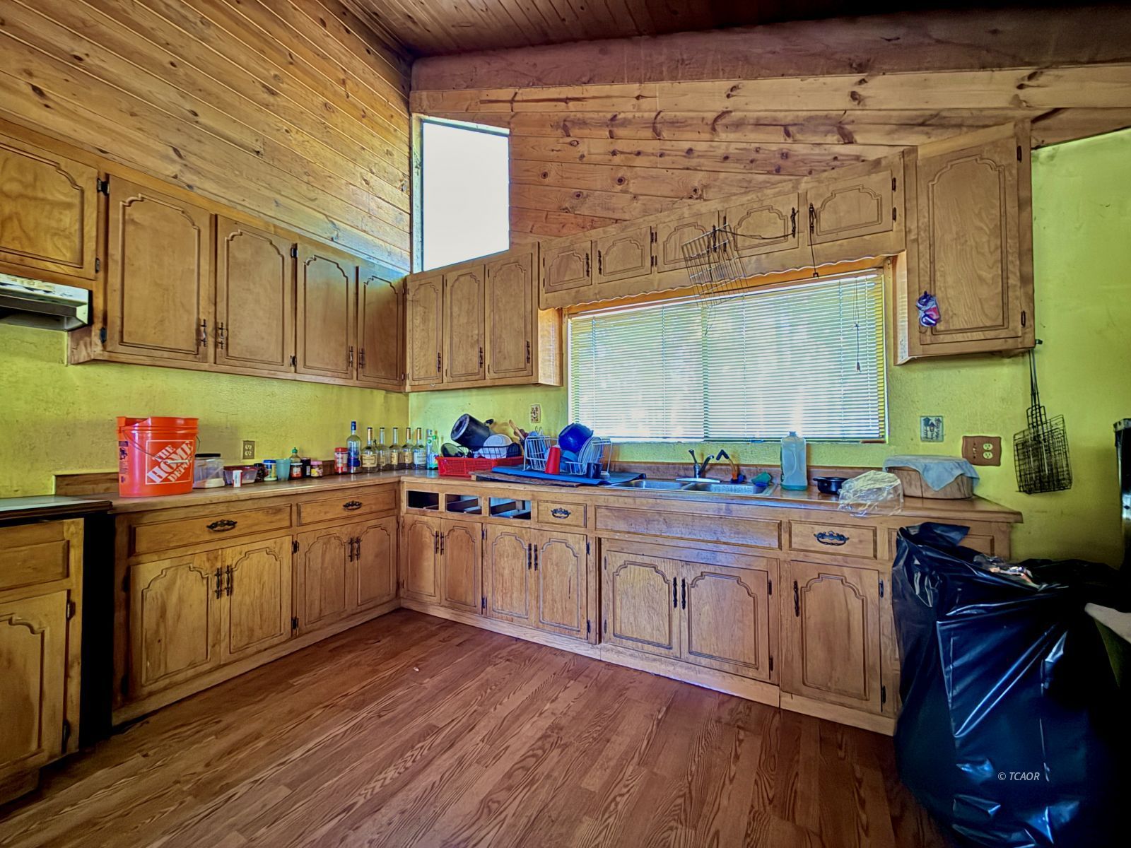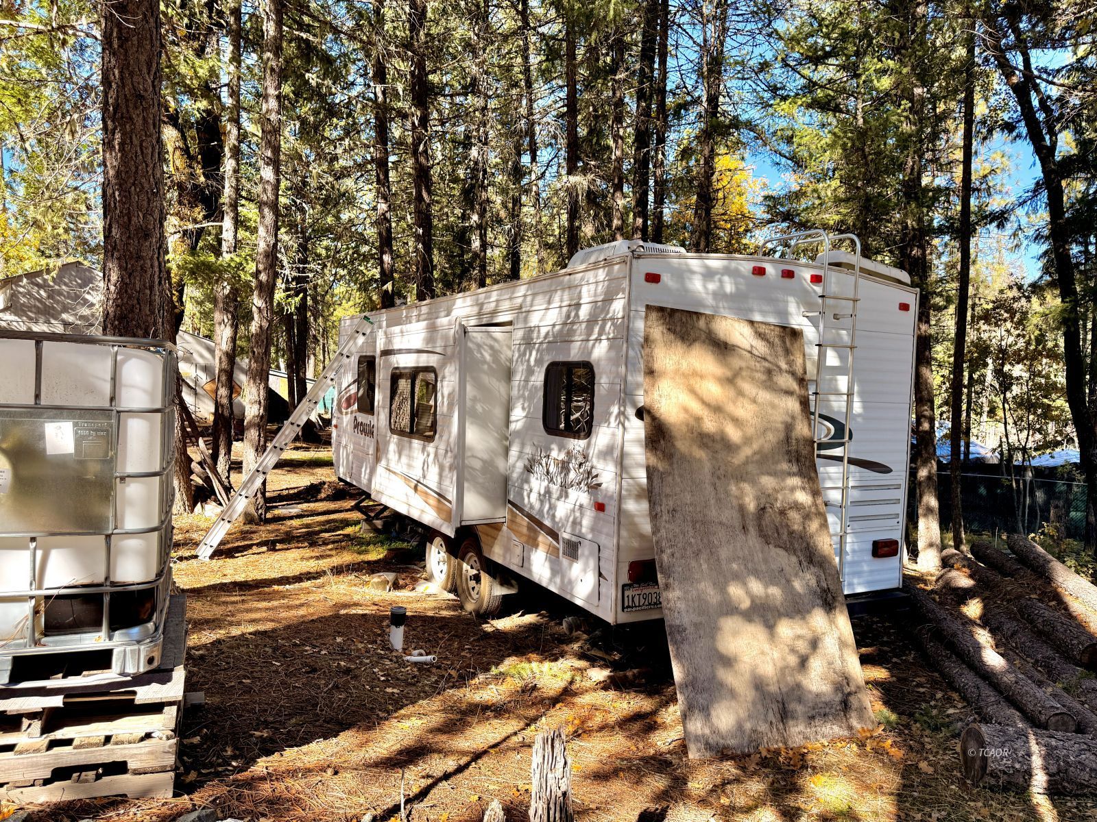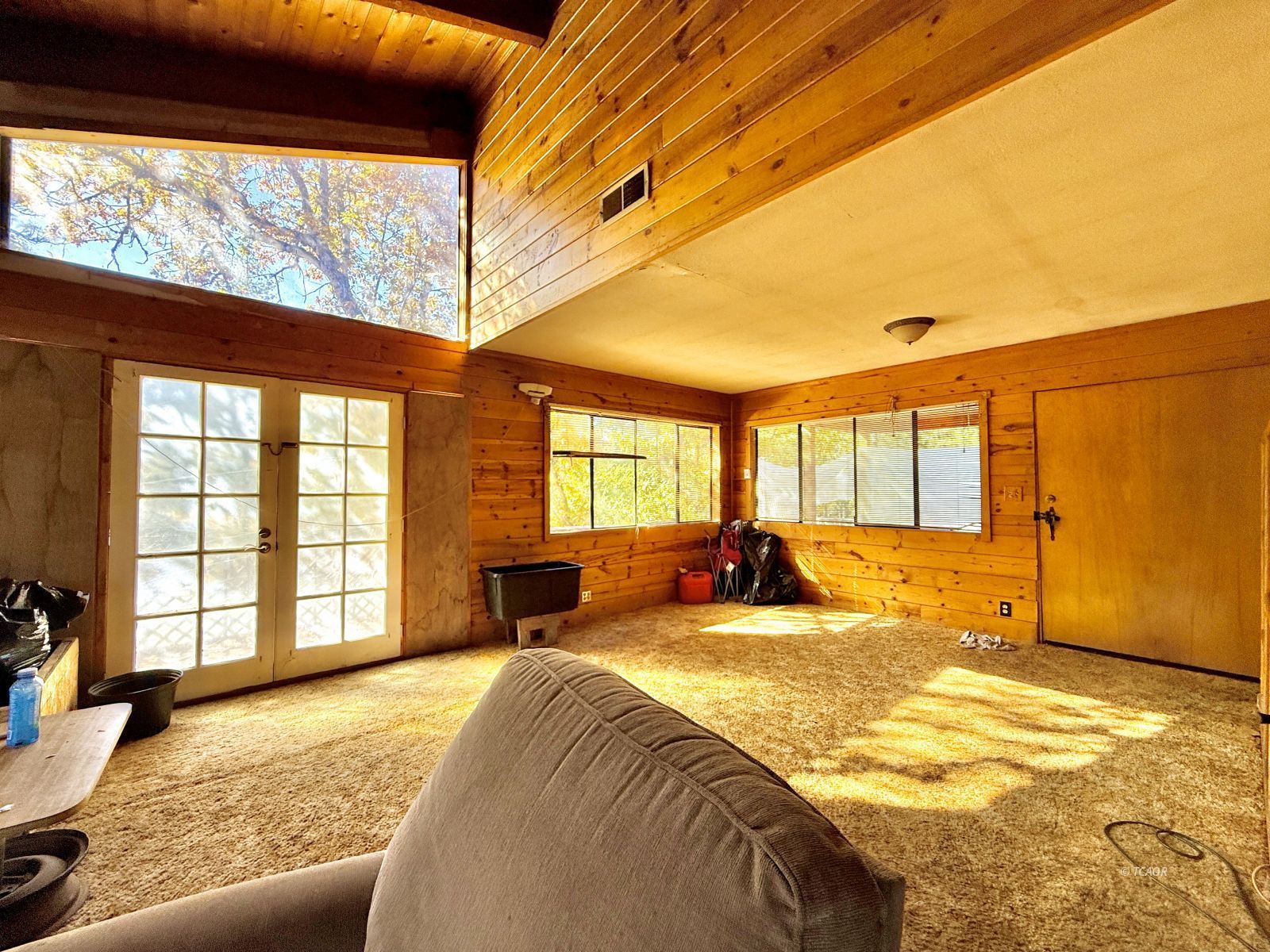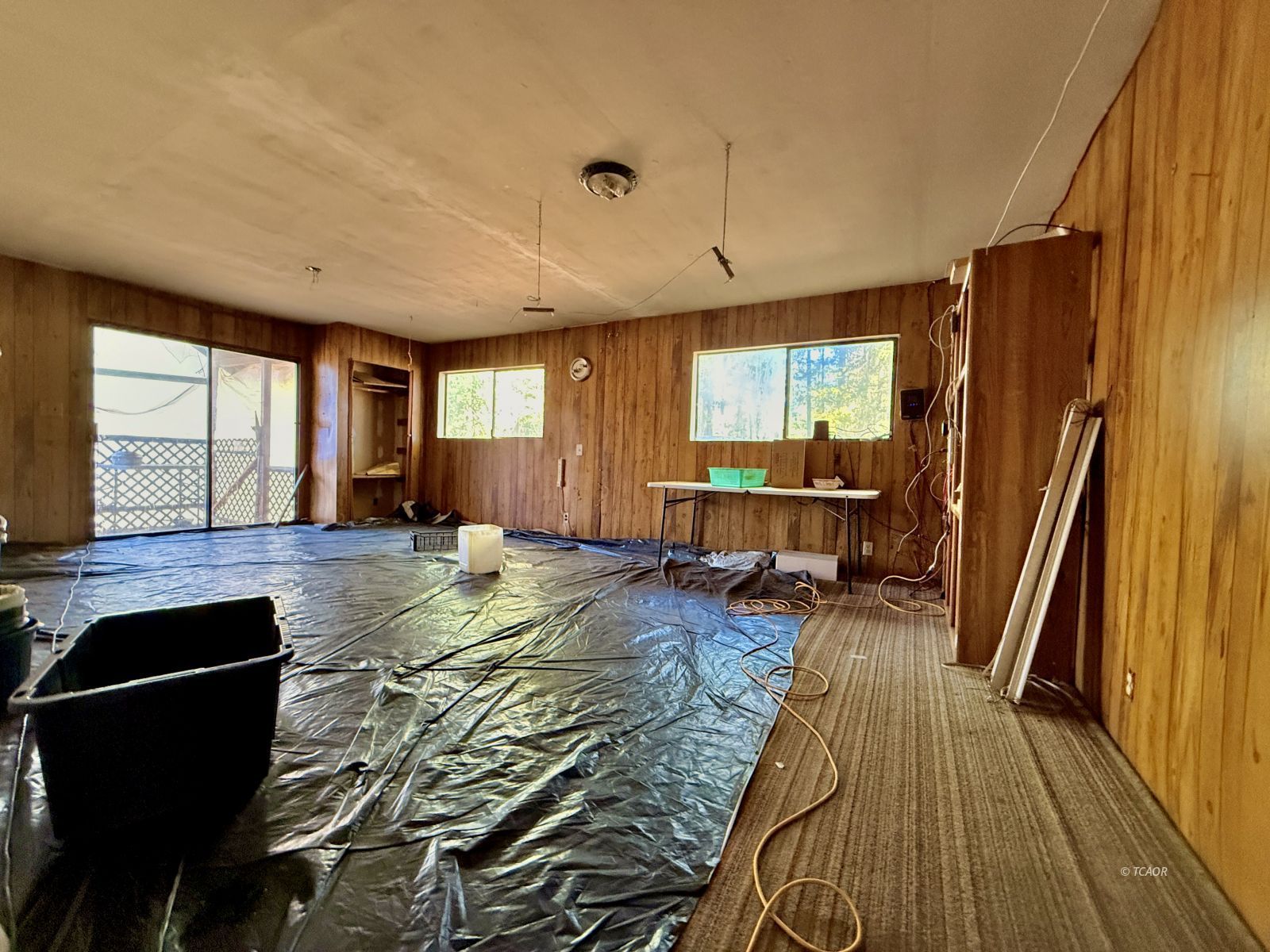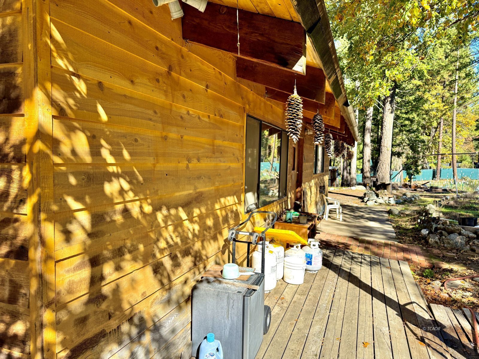 Two adjacent 1.5+ acre lots each with garden sites and solid temporary greenhouses already set up... Newest well and solar water pump components are only 3 years old. A larger 3BD/2BA home with cathedral ceilings and exposed beams. The wrap around deck would make for great outdoor entertaining in the summer overlooking the pond. This well established ranchette was left abandoned a few years ago and will need some plumbing repairs and finishing touches to become a fully functioning residence again. Property is set up for off-grid living with generator wiring, some solar features and a wood-fuel cook stove. After cleanup and repairs, this could be one of the largest, most solid and complete homes in the Trinity Pines subdivision. There's a small pond on the property, bearing water year-round with bass and goldfish. The large garage/barn has room for several cars on the ground level, but also has workshop spaces on each side and an upstairs area for additional storage or an ADU apartment for guests. Parts of garage are insulated with reflective panels and it's fully wired for electric. Both parcels are fully fenced.