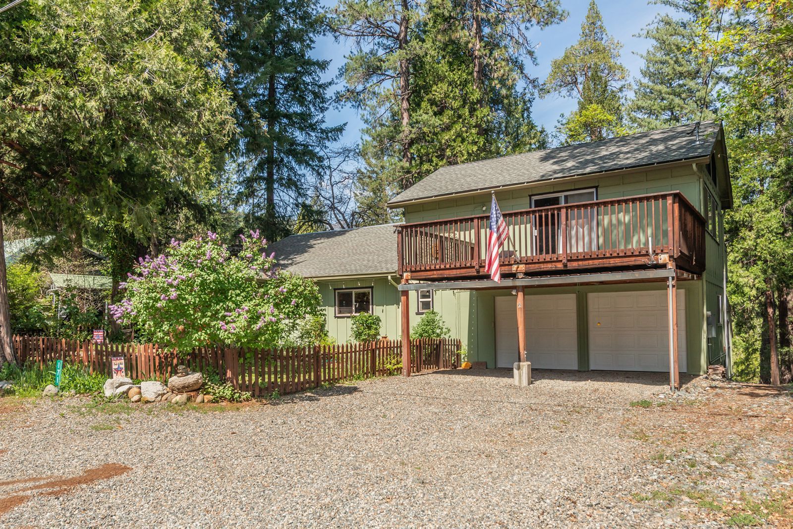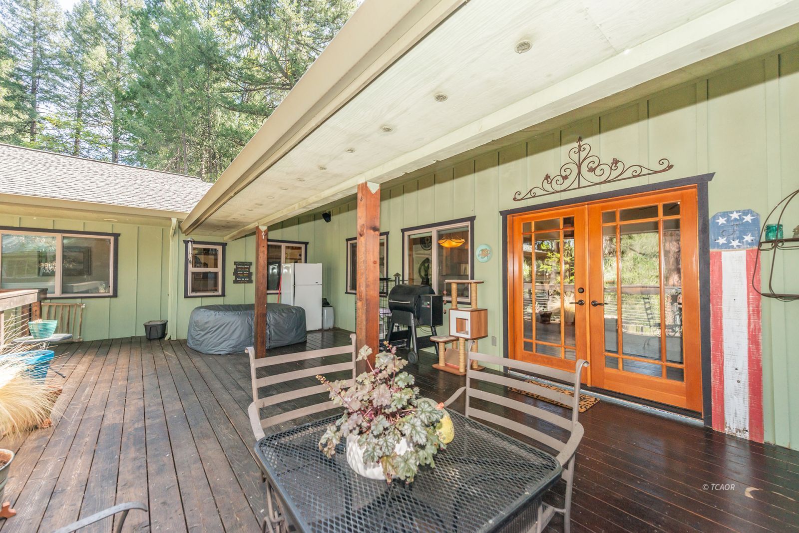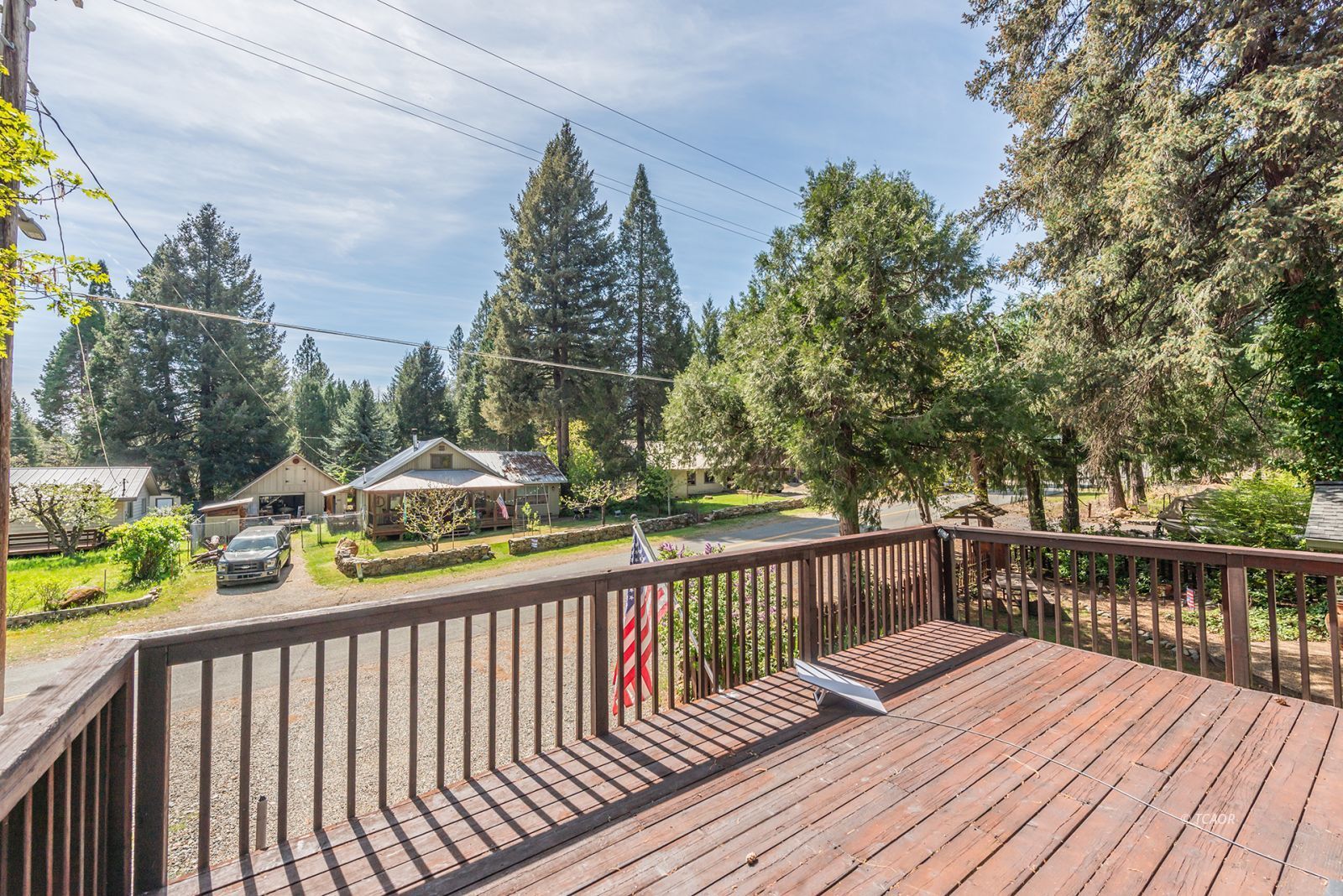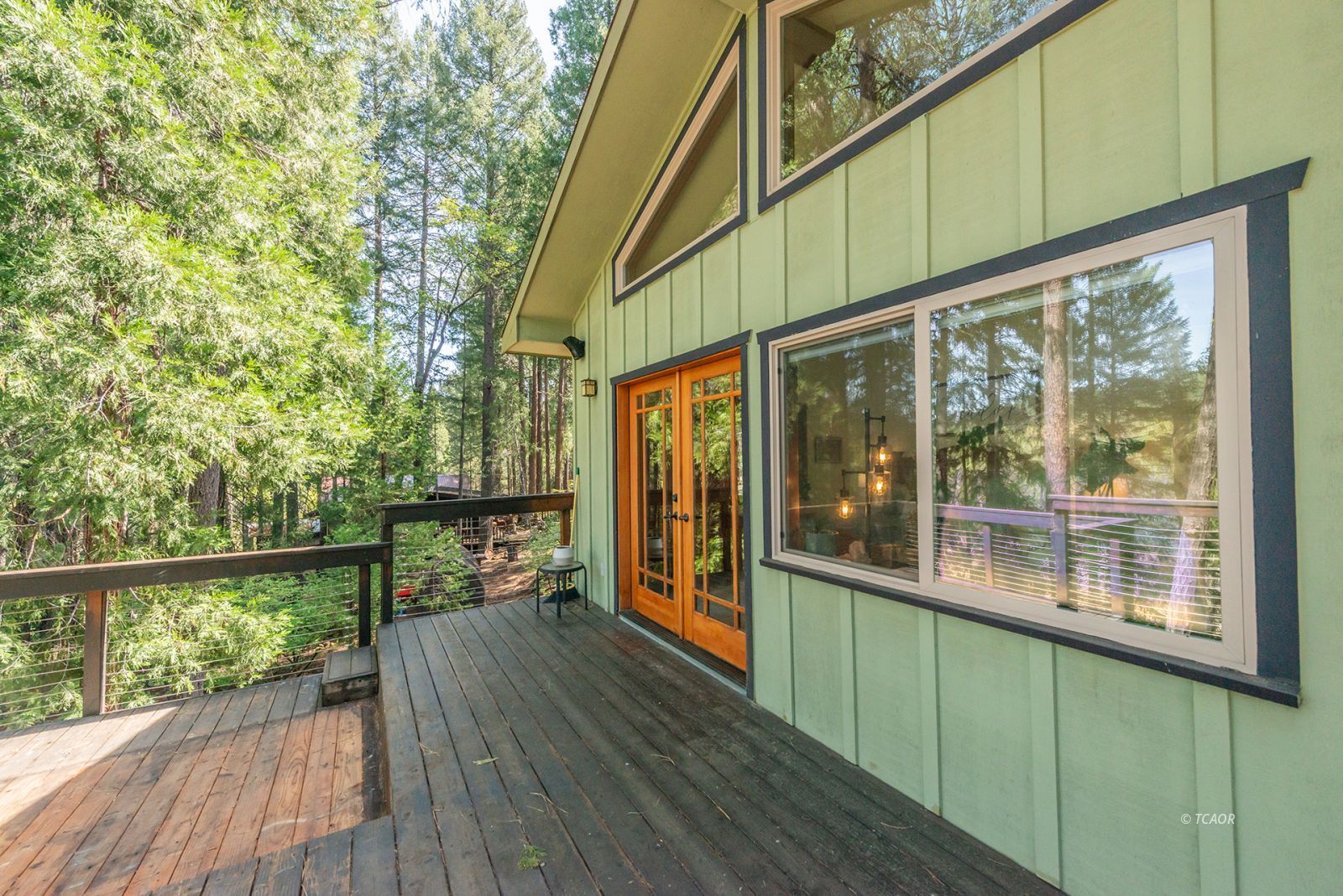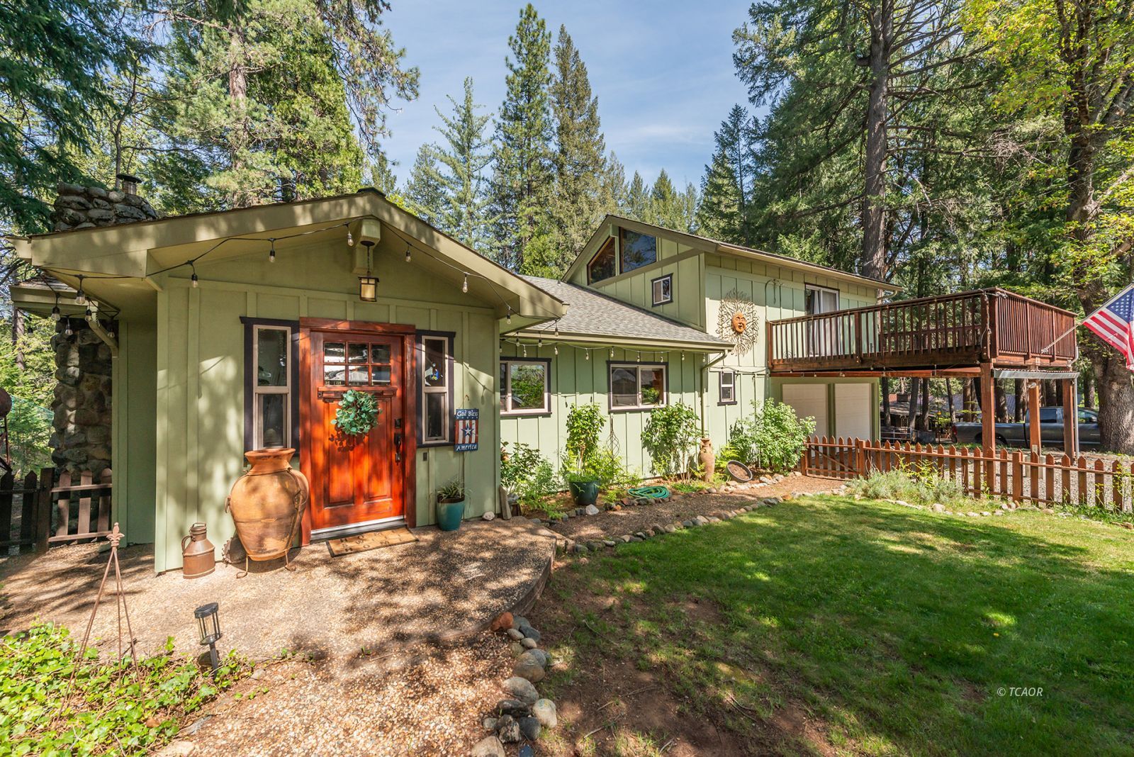 Beautifully restored in 2008, this home offering 2,174 sq ft with 2 spacious primary ensuite bedrooms and 2.5 baths. Blending historic character with modern updates, the home features Douglas fir hardwood doors, trim, and window casings, tile entry, and engineered hardwood flooring in the main living areas.Kitchen includes granite countertops, Hickory cabinetry, and walk-in pantry. Dining room flows to living area both with French doors leading to covered back deck, plus a cozy sitting room with custom carpet and floor-to-ceiling blue pine shelving.Main-level primary suite offers walls of windows, French doors to a private deck, and spa-style bath with radiant heated tile floors, soaking tub, granite counters, and walk-in tile shower. Upstairs features a large second primary suite with balcony access, front deck, and loft. Additional amenities include half bath on main level, attached 2-car garage with workshop, lower workshop, expansive back decking with mountain and creek views, and whole-house generator (2022), all on .51 acres. Close to Trinity Lake and Trinity Alps Wilderness-ideal for year-round living or a mountain retreat.