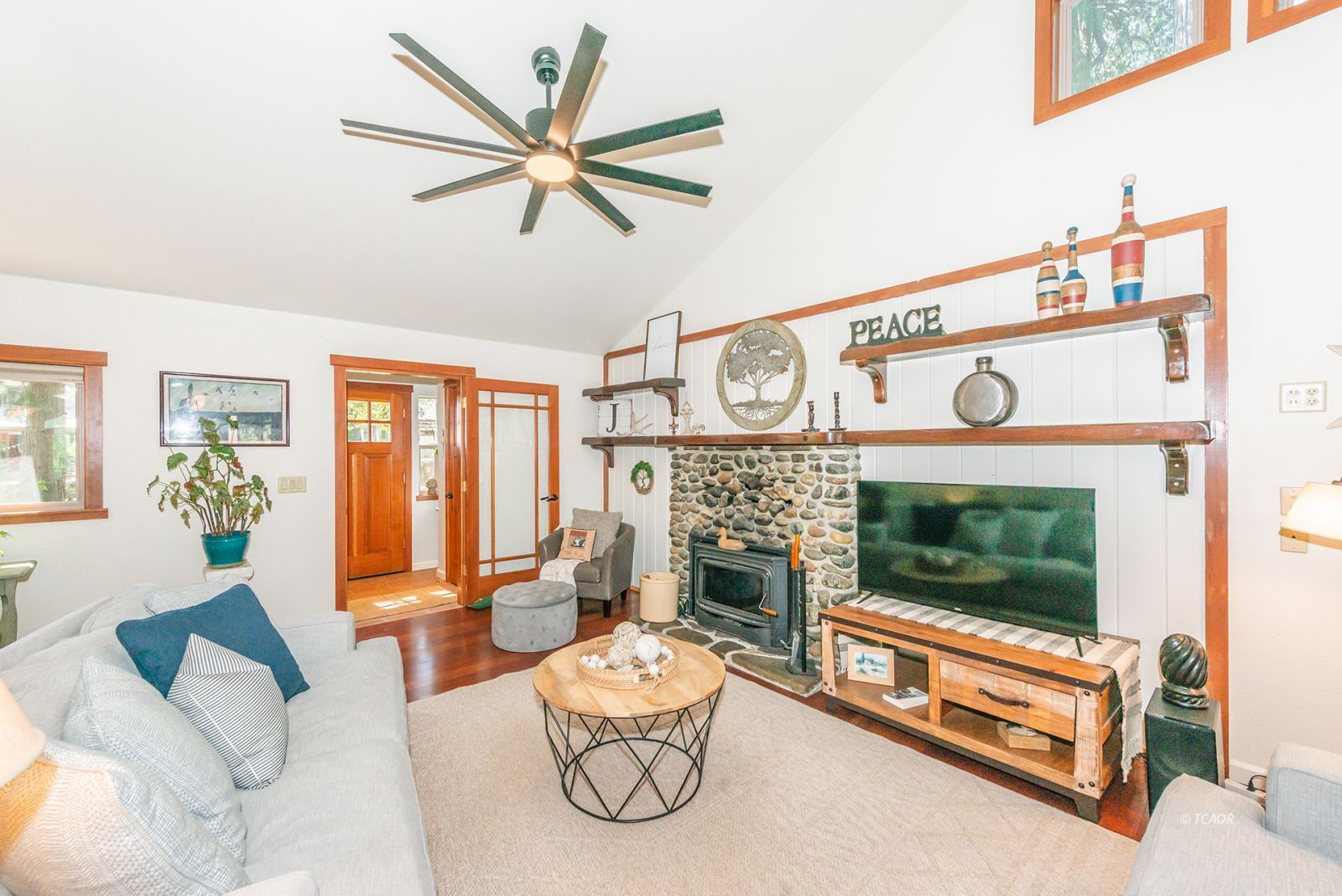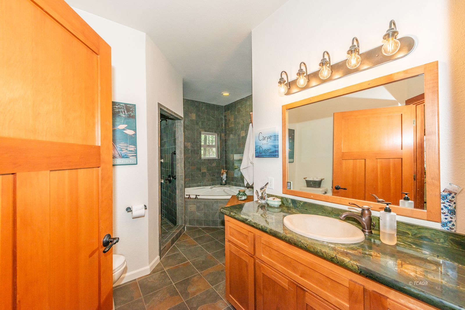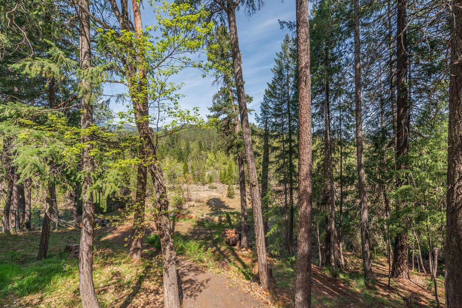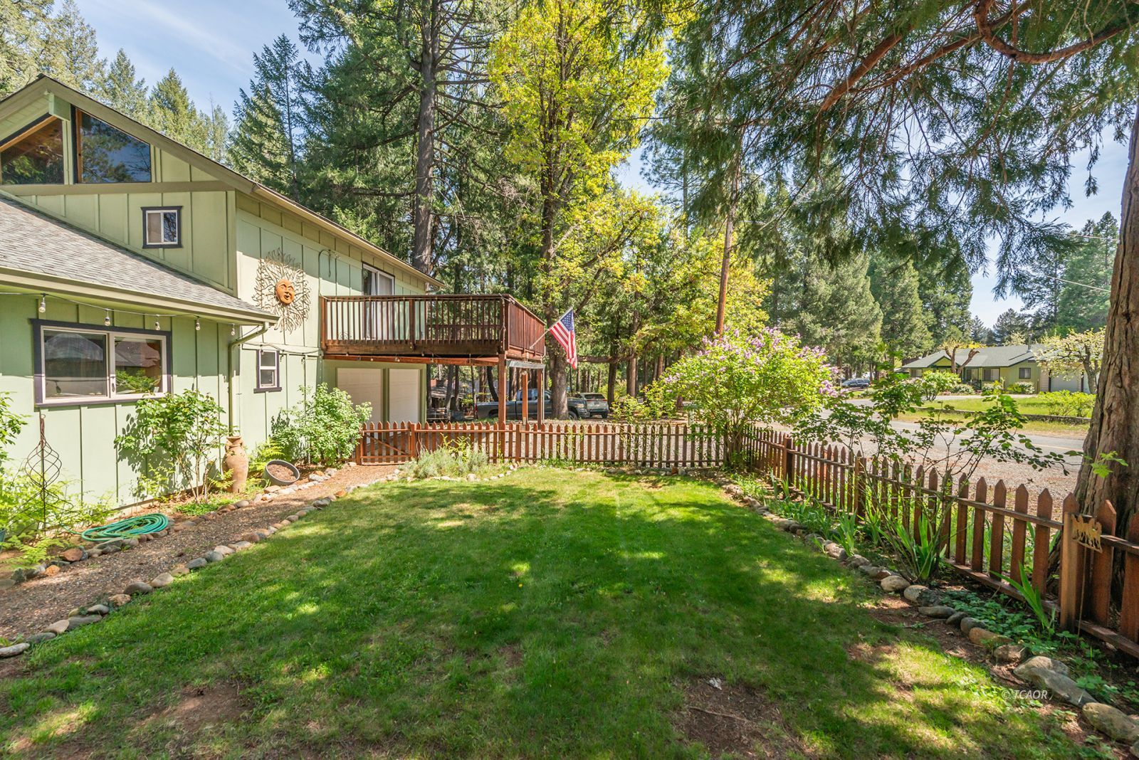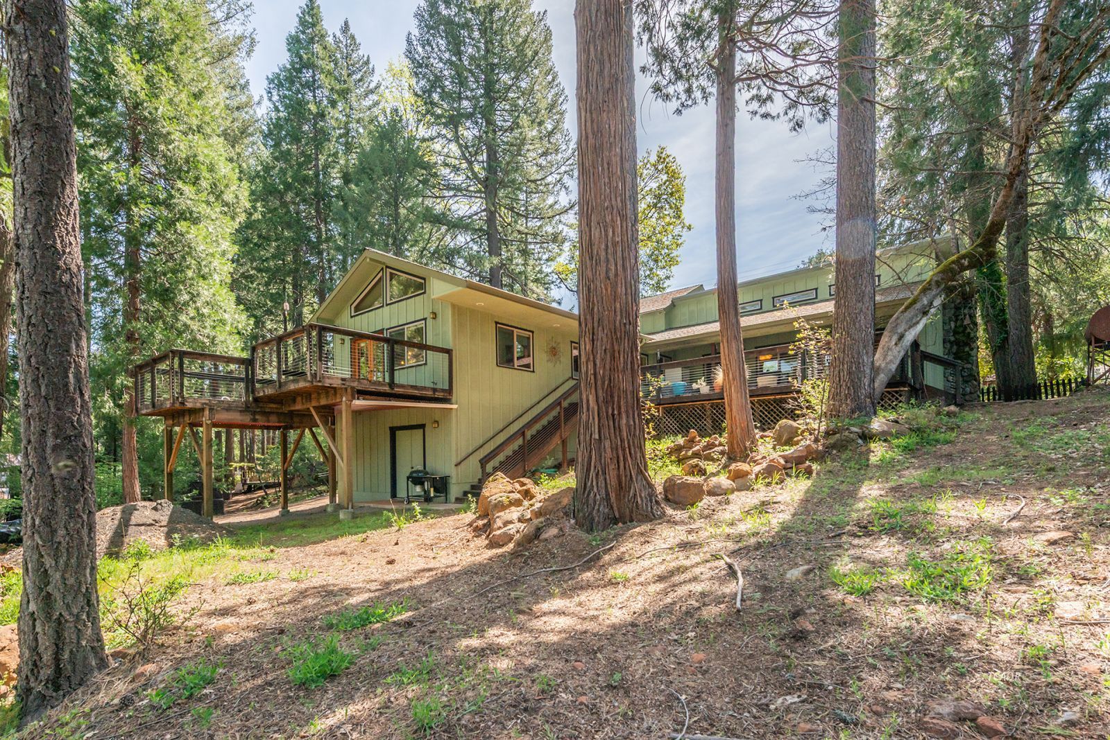 Beautifully restored in 2008, this home offering 2,174 sq ft with 2 spacious primary ensuite bedrooms and 2.5 baths. Blending historic character with modern updates, the home features Douglas fir hardwood doors, trim, and window casings, tile entry, and engineered hardwood flooring in the main living areas.Kitchen includes granite countertops, Hickory cabinetry, and walk-in pantry. Dining room flows to living area both with French doors leading to covered back deck, plus a cozy sitting room with custom carpet and floor-to-ceiling blue pine shelving.Main-level primary suite offers walls of windows, French doors to a private deck, and spa-style bath with radiant heated tile floors, soaking tub, granite counters, and walk-in tile shower. Upstairs features a large second primary suite with balcony access, front deck, and loft. Additional amenities include half bath on main level, attached 2-car garage with workshop, lower workshop, expansive back decking with mountain and creek views, and whole-house generator (2022), all on .51 acres. Close to Trinity Lake and Trinity Alps Wilderness-ideal for year-round living or a mountain retreat.