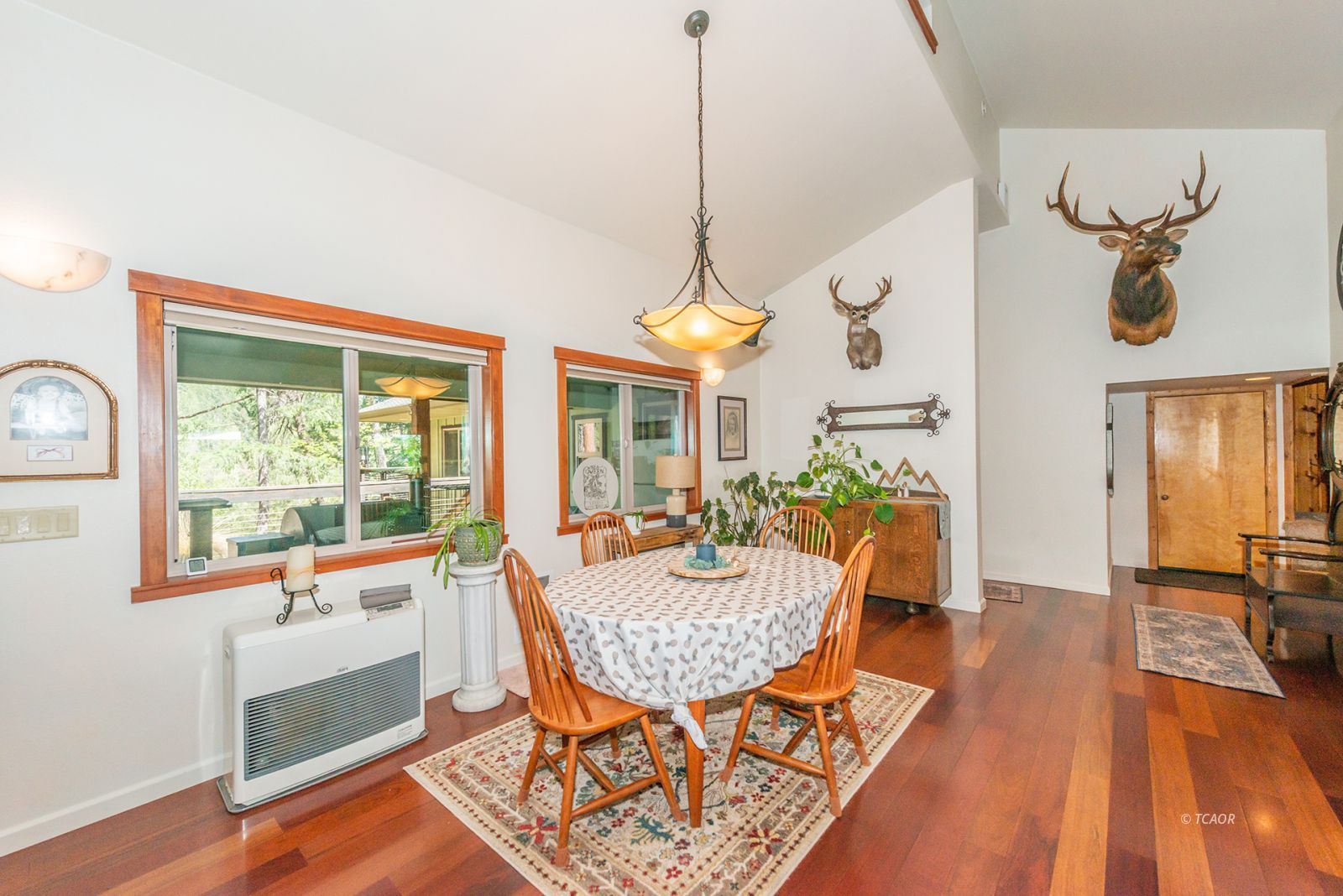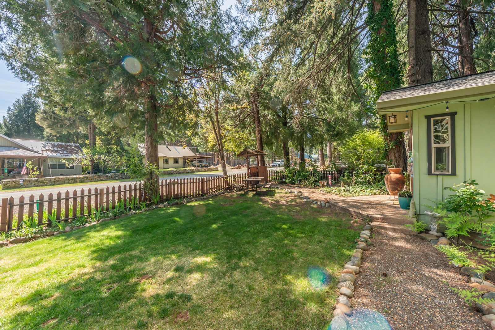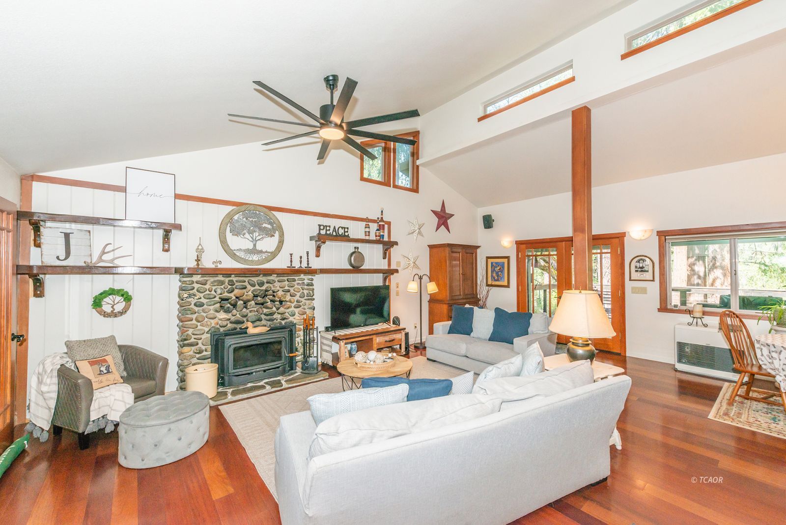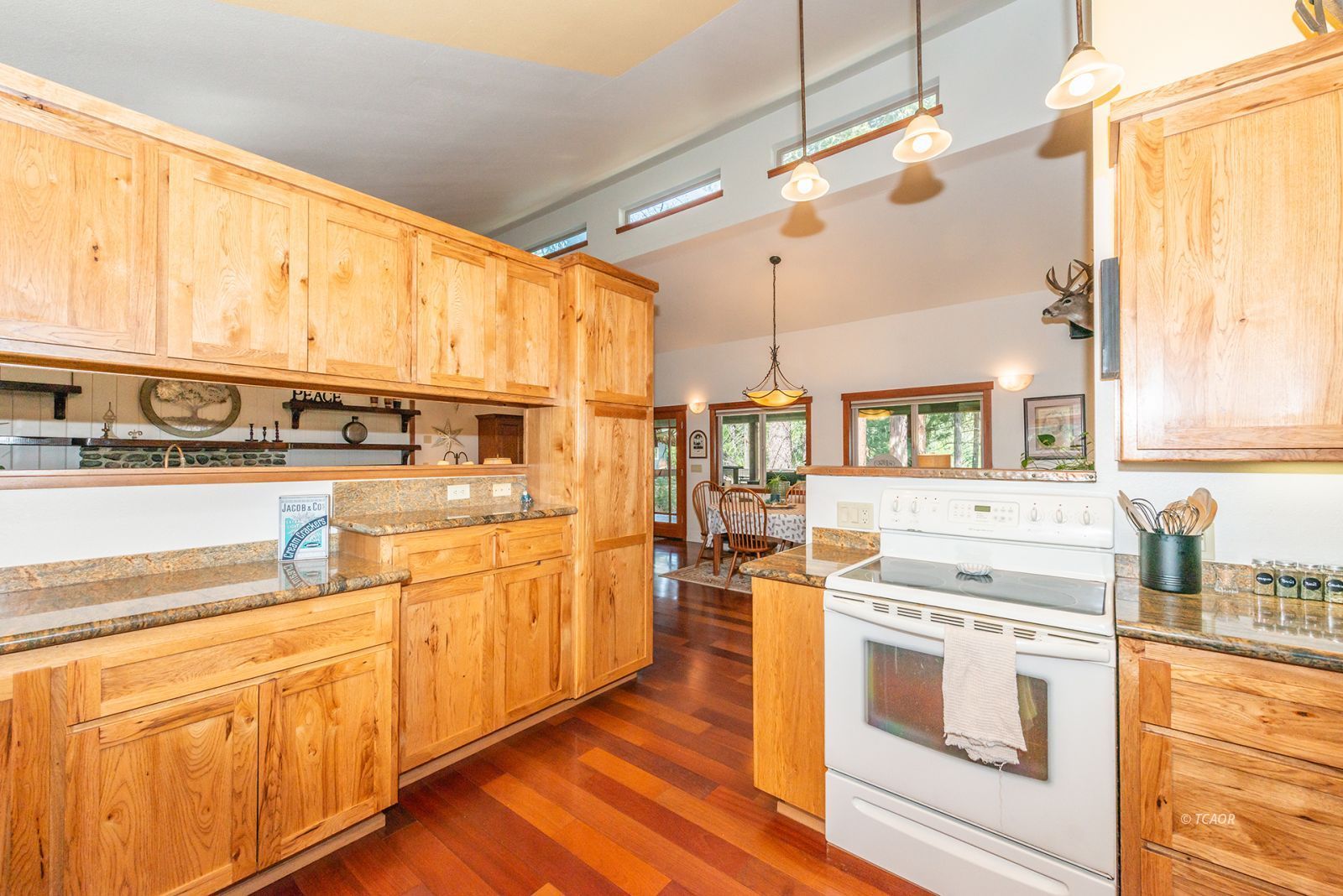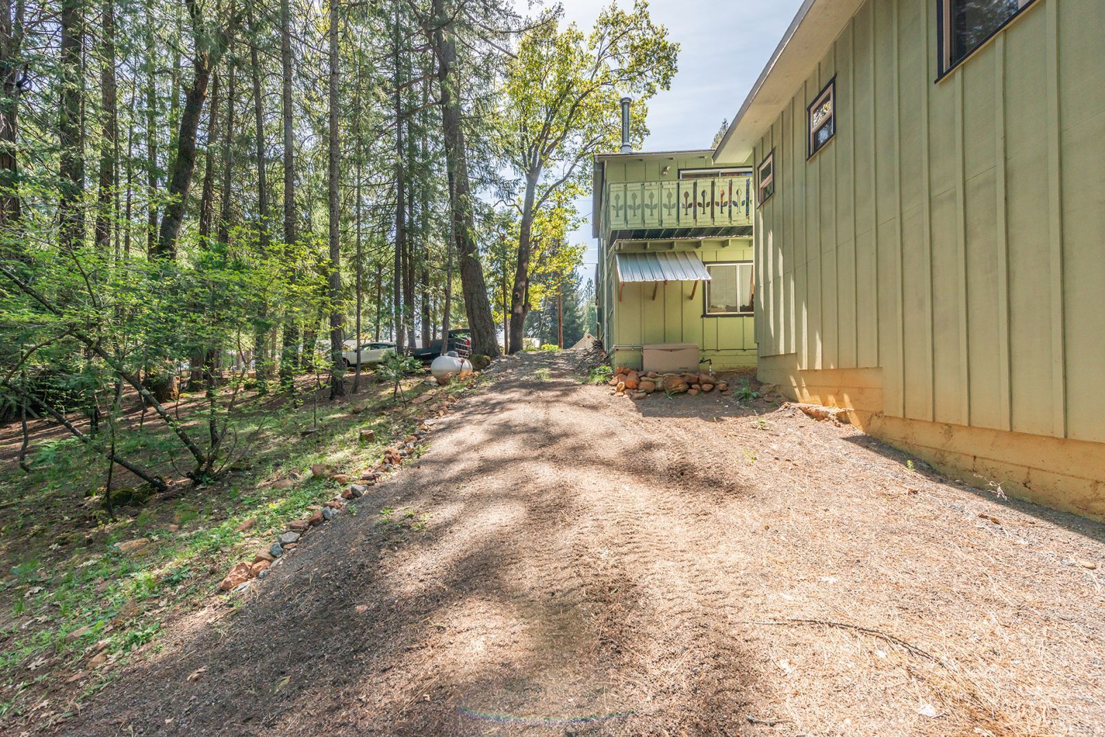 Beautifully restored in 2008, this home offering 2,174 sq ft with 2 spacious primary ensuite bedrooms and 2.5 baths. Blending historic character with modern updates, the home features Douglas fir hardwood doors, trim, and window casings, tile entry, and engineered hardwood flooring in the main living areas.Kitchen includes granite countertops, Hickory cabinetry, and walk-in pantry. Dining room flows to living area both with French doors leading to covered back deck, plus a cozy sitting room with custom carpet and floor-to-ceiling blue pine shelving.Main-level primary suite offers walls of windows, French doors to a private deck, and spa-style bath with radiant heated tile floors, soaking tub, granite counters, and walk-in tile shower. Upstairs features a large second primary suite with balcony access, front deck, and loft. Additional amenities include half bath on main level, attached 2-car garage with workshop, lower workshop, expansive back decking with mountain and creek views, and whole-house generator (2022), all on .51 acres. Close to Trinity Lake and Trinity Alps Wilderness-ideal for year-round living or a mountain retreat.
