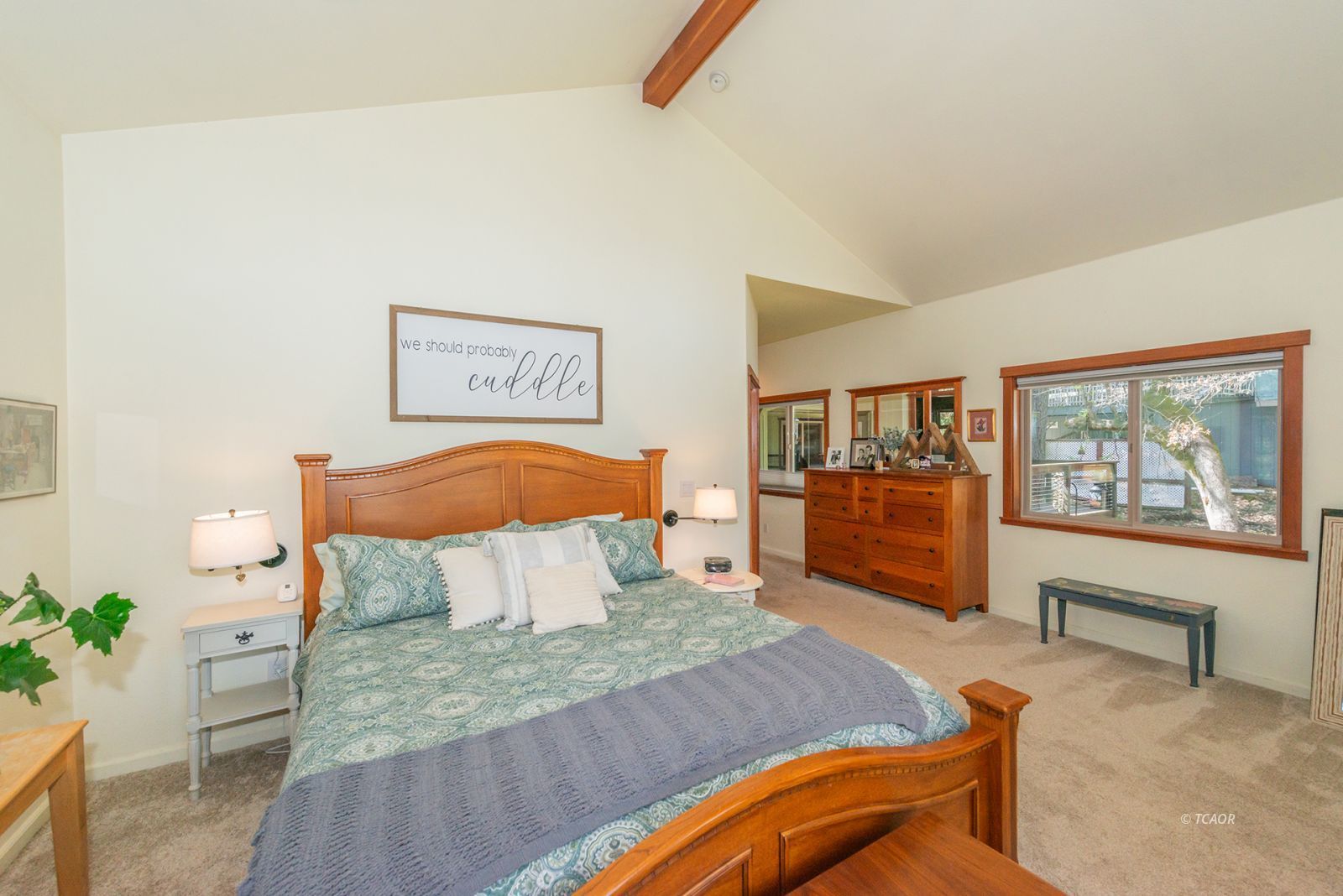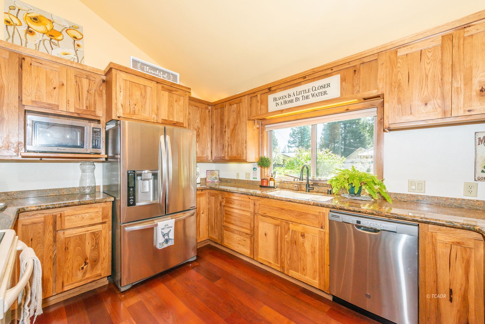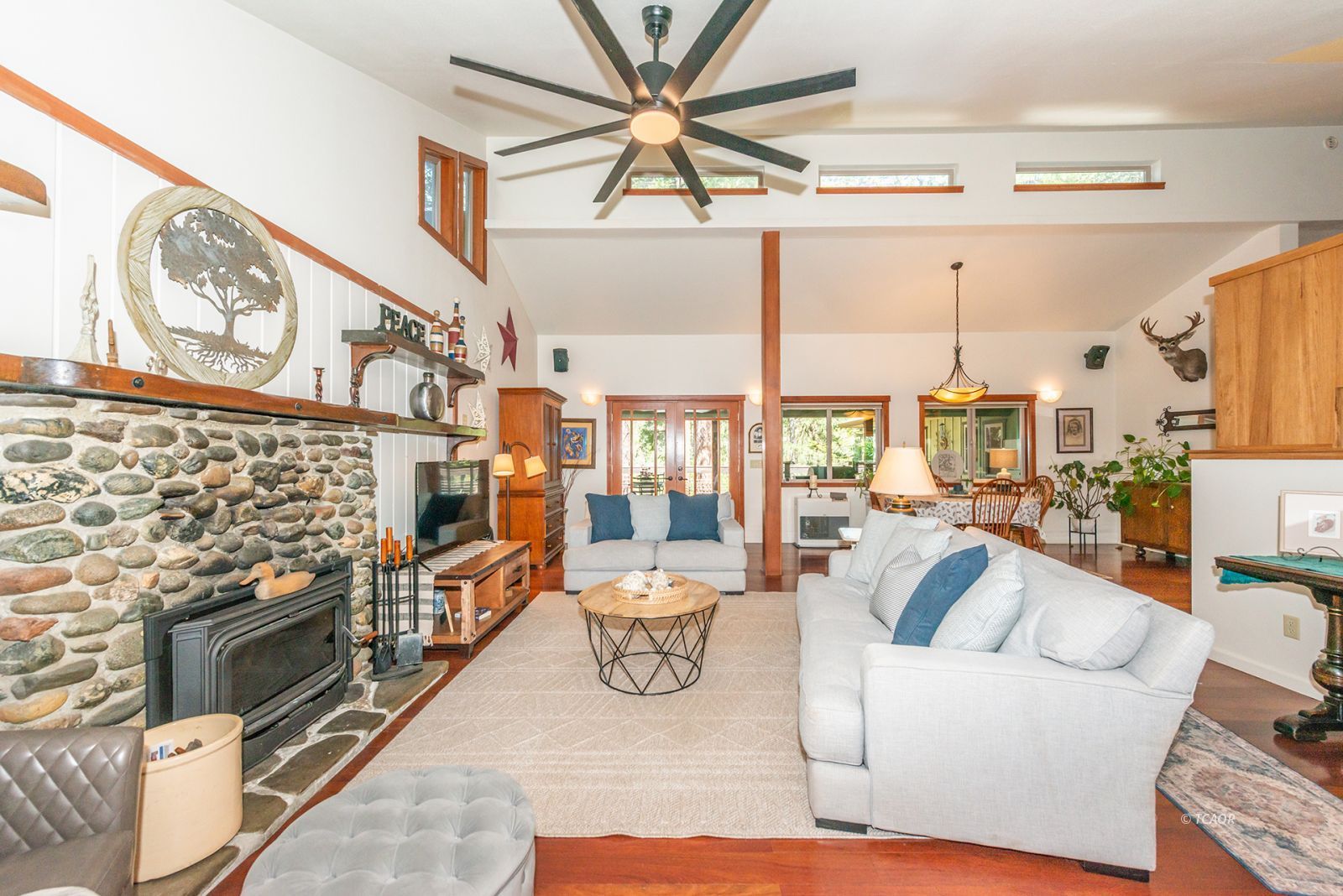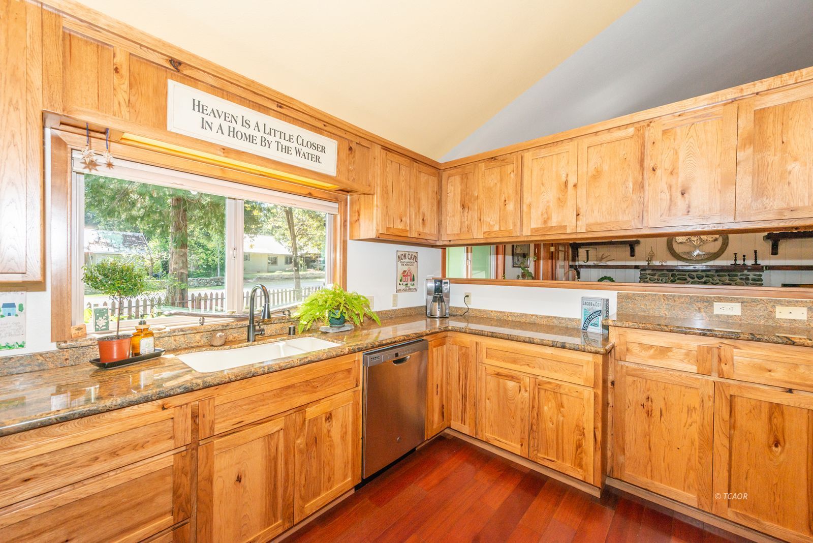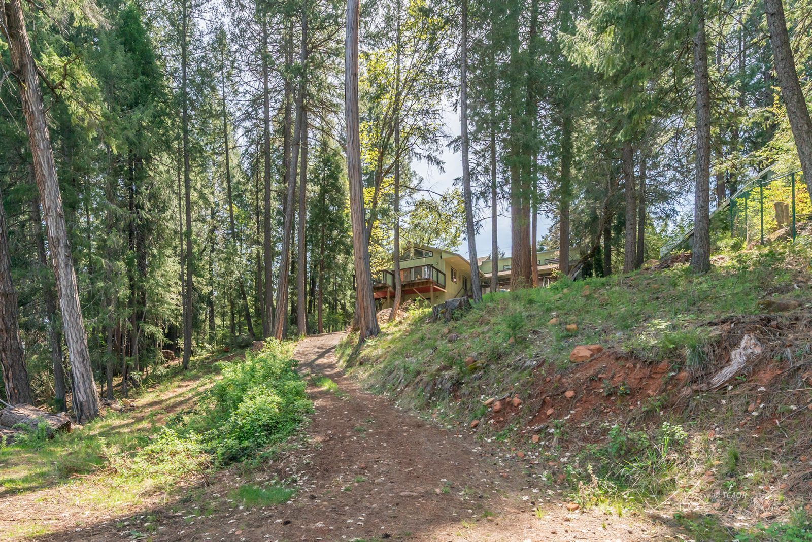 Beautifully restored in 2008, this home offering 2,174 sq ft with 2 spacious primary ensuite bedrooms and 2.5 baths. Blending historic character with modern updates, the home features Douglas fir hardwood doors, trim, and window casings, tile entry, and engineered hardwood flooring in the main living areas.Kitchen includes granite countertops, Hickory cabinetry, and walk-in pantry. Dining room flows to living area both with French doors leading to covered back deck, plus a cozy sitting room with custom carpet and floor-to-ceiling blue pine shelving.Main-level primary suite offers walls of windows, French doors to a private deck, and spa-style bath with radiant heated tile floors, soaking tub, granite counters, and walk-in tile shower. Upstairs features a large second primary suite with balcony access, front deck, and loft. Additional amenities include half bath on main level, attached 2-car garage with workshop, lower workshop, expansive back decking with mountain and creek views, and whole-house generator (2022), all on .51 acres. Close to Trinity Lake and Trinity Alps Wilderness-ideal for year-round living or a mountain retreat.